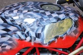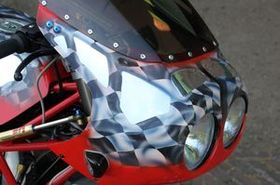 Zu guter letzt wurde das Farbkleid von der Firma Artworks gefertigt. Bedingung war, dass das polierte Aluminium und eine Start- Zielflagge mit in die Lackierung einfließen sollte.