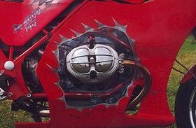 Da zu dem Zeitpunkt die Doppelscheinwerfer in Mode kamen, wurden welche von der GSX 750 R gekauft und ein Verkleidungsoberteil, natürlich auch aus Alu, drum herum gebastelt. Dabei wurde das Oberteil so gefertigt und das Unterteil so umgebaut, dass die Maschine sowohl mit Cockpit- als auch mit Vollverkleidung gefahren werden konnte.
